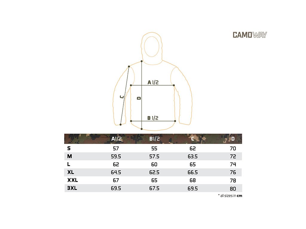 Bunda CamoWAY disponuje taktiež kapucňou, ktorú je možné zatiahnuť pomocou sťahovacieho klipu. Rukávy sú na koncoch mierne zúžené a opatrené jemnou gumičkou, pre lepšie obopnutie zápästia.