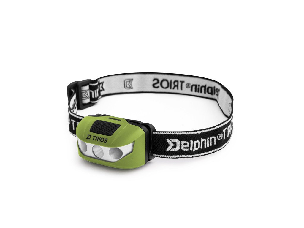 TRIOS predstavuje základný typ čelovej lampy, ktorá vás osloví nie len svojou cenou. Ponúka tri LED diódy zabudované v zelenom plastovom tele. To je naklápateľné, a tak si môžete pohodlne posvietiť či už na zhotovenie montáže, či na knihu v pohodlí bivaku. Samotné telo lampy je umiestnené na elastickom popruhu s vyobrazením loga Delphin a s názvom TRIOS. Lampa sa zapína masívnym čiernym vypínačom na vrchnej časti čelovky. Čelovka 3 úrovne bieleho svietenia. Po jednom kliknutí svieti lampa 70% výkonom a vydrží 5 hodín, po druhom kliknutí svieti 100% výkonom a vydrží svietiť 3,5h, po treťom kliknutí svieti na 30% a výdrž batérie sa predlžuje až na 12 hodín. Dlhším podržaním tlačidla aktivujete červené bočné diódy, ktoré môžu svietiť, blikať, alebo vydávať signál SOS.