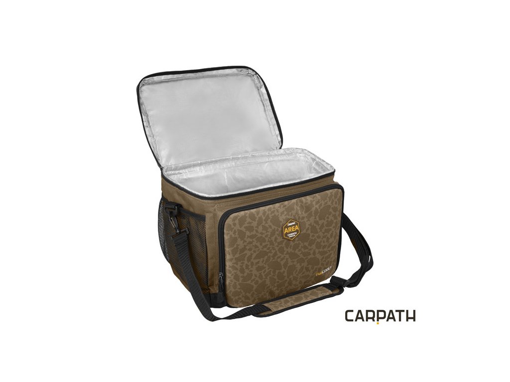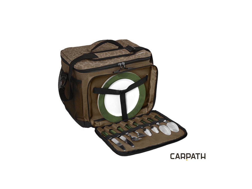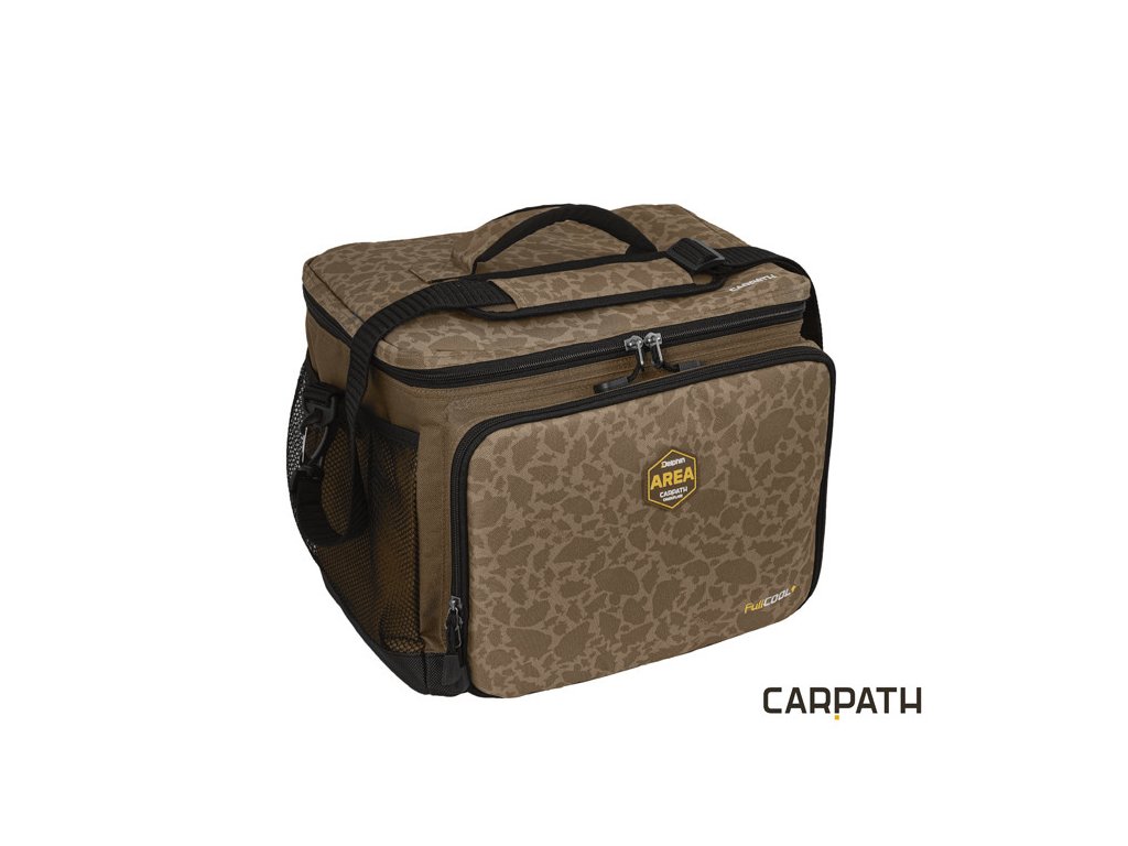 Termotaška s príborom Delphin Area FullCOOL+ Carpath je určená na prevoz potravín s potrebou čo najdlhšieho uchovania ich pôvodnej teploty. Celá taška je z vnútornej strany opatrená termovrstvou. Zároveň je osadená polstrovaním o hrúbke 8mm, čo zabezpečuje jej stabilitu, aj keď je prázdna. Táto vrstva polstrovania sa správa ako dodatočný izolant a zvyšuje tak dobu uchovania potravín. Termoizolačná vrstva bola navrhnutá tak, že prekrýva vonkajší okraj o 1cm a zároveň je všitá aj pod celý obvodový zips. Výrazne tým predlžuje dobu ochrany nástrah či potravín. V prípade, že by táto vrstva nebola všitá pod zipsom, vzduch prúdiaci cez zips by oveľa rýchlejšie vnikal dovnútra. Taška je z boku dodatočne osadená dvoma sieťkami, ktoré slúžia ako úložný priestor.