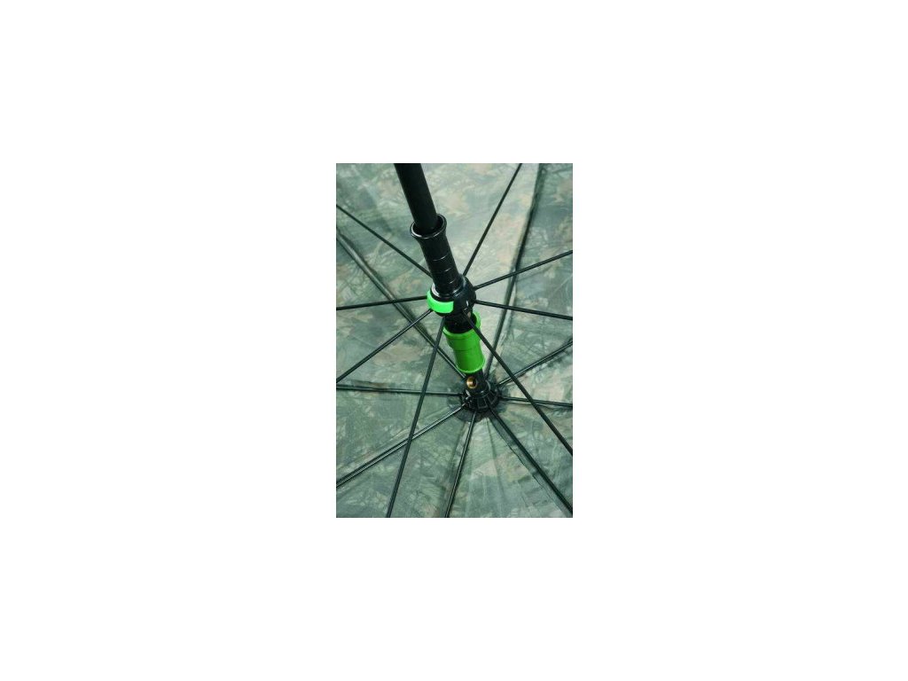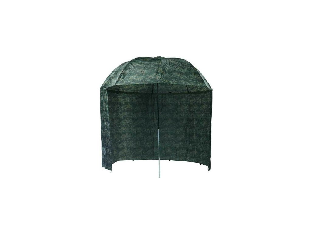 Kvalitný dáždnik s kĺbom a bočnicami. Je vybavený hrubostennou tyčou, odolnou proti deformácii. Poťah je vyrobený z ľahkého, avšak 100% nepriepustného „pogumovaného“ materiálu v zaujímavej maskáčovej úprave s lepenými švami.