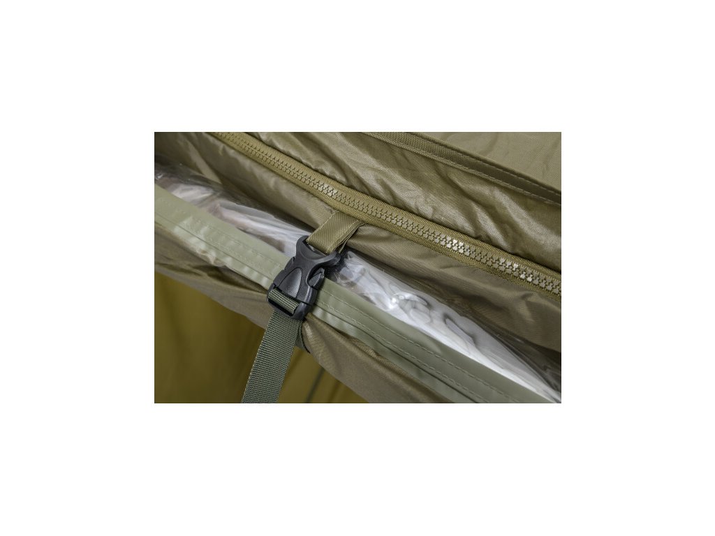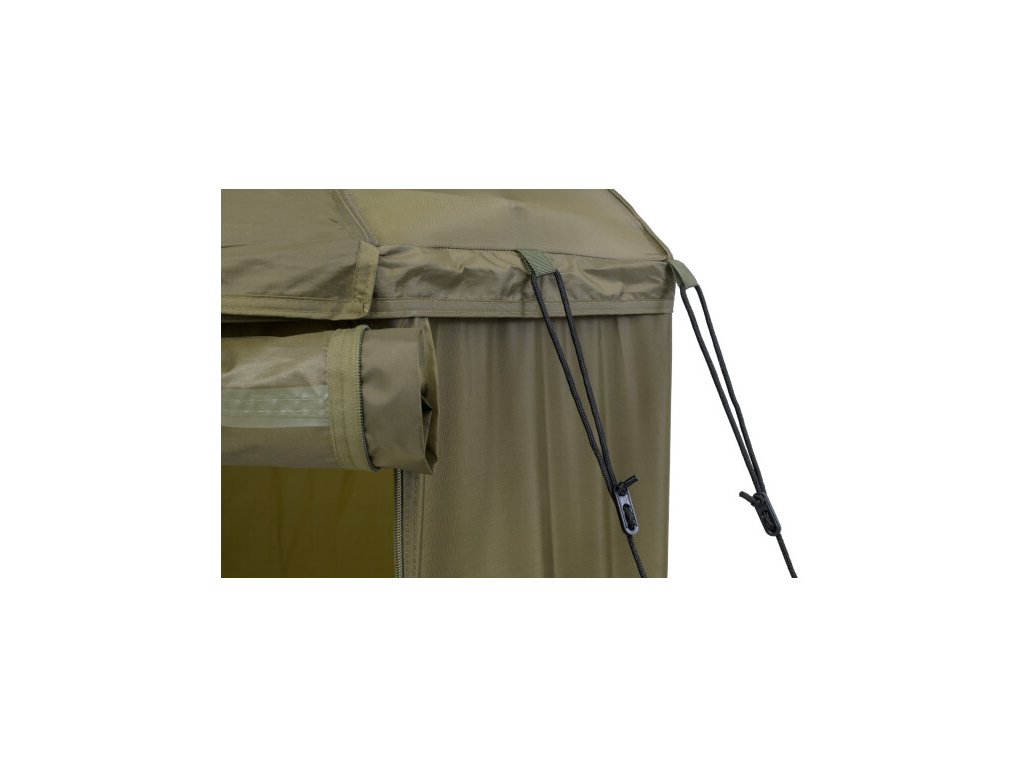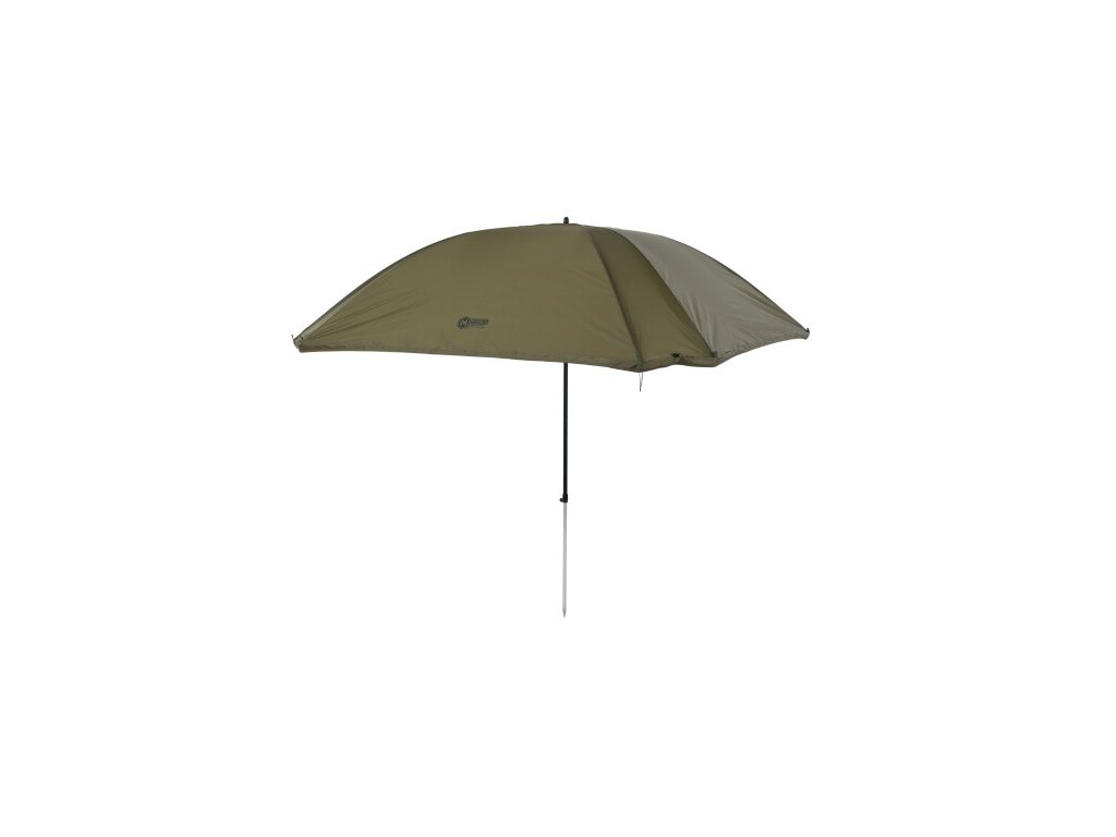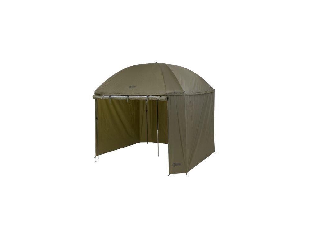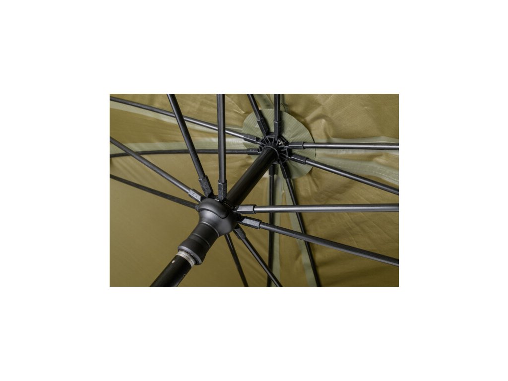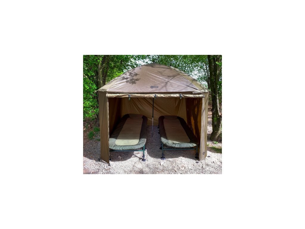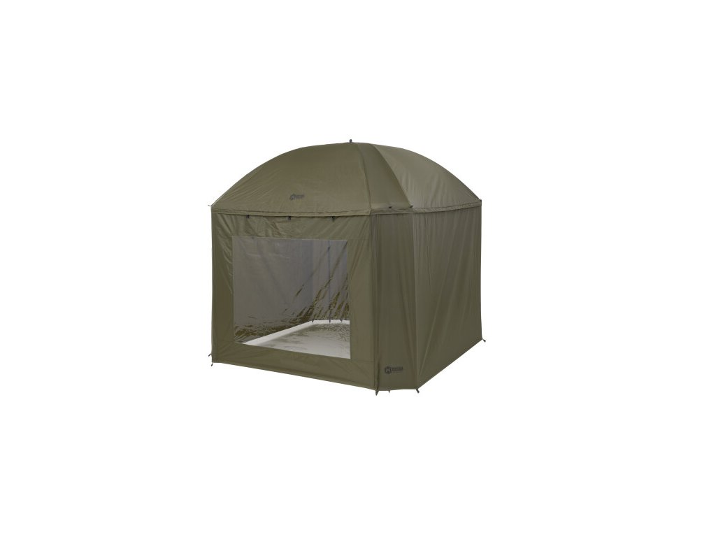Kompletne zakrytý dáždnik štvorcového tvaru s obrími rozmermi. Možno do neho umiestniť dve veľké rybárske lehátka. Rozmerom dáždnika je plne prispôsobená jeho konštrukcia a použité materiály. Kostra je vyrobená z pevných a pružných laminátových rebier, ktoré okrem vysokej tuhosti a stability zaisťujú aj veľkú odolnosť. Tú oceníte najmä pri silnom vetre, kedy by štandardné drôtené rebrá boli zdeformované alebo úplne zničené. Kvalitný nylonový plášť ponúka veľmi nízku hmotnosť, nekompromisný vodný stĺpec 8000mm a kompletne podlepené švy. Bočnica je po celom obvode pripevnená robustným zipsom, krytým odkvapničkou. Predný panel s rozmerným oknom je možné ľahko rozopnúť a zrolovať nahor. Vo veternom počasí je možné dáždnik stabilizovať pomocou štyroch kotviacich laniek. Súčasťou dodávky je aj sada plnohodnotných bivakových kolíkov pre perfektné ukotvenie aj v náročných podmienkach. Skvelým doplnkom tohto dáždnika je unikátna stabilizačná sada do extrémnych podmienok dodávaná samostatne.