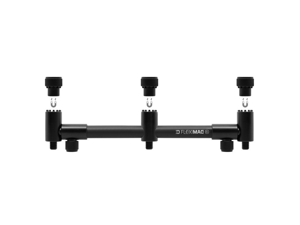 Ramená sú zo spodnej časti zrezané do roviny, takže po utiahnutí poistných skrutiek perfektne držia na mieste a nepretáčajú sa. FlexiMAG BUZZ je vyrobená z pevného hliníka, potiahnutého odolnou čiernou práškovou farbou. Dodávame ju v dvoch veľkostiach, konkrétne kratšia L určená na dva a dlhšia XL na tri prúty.