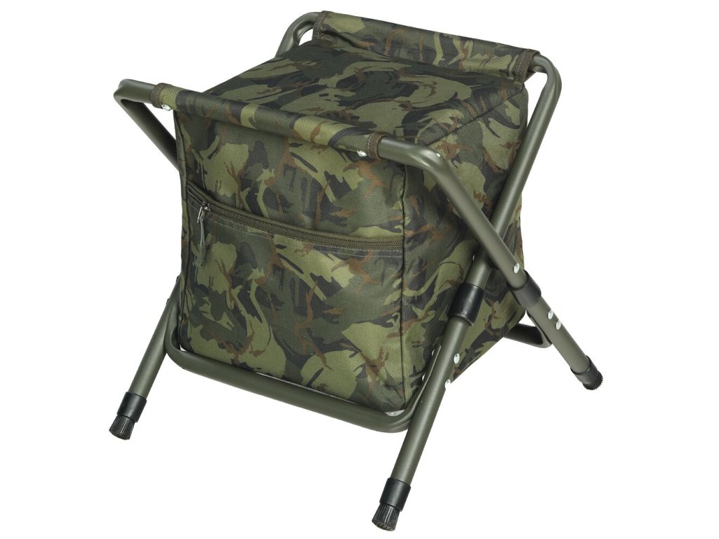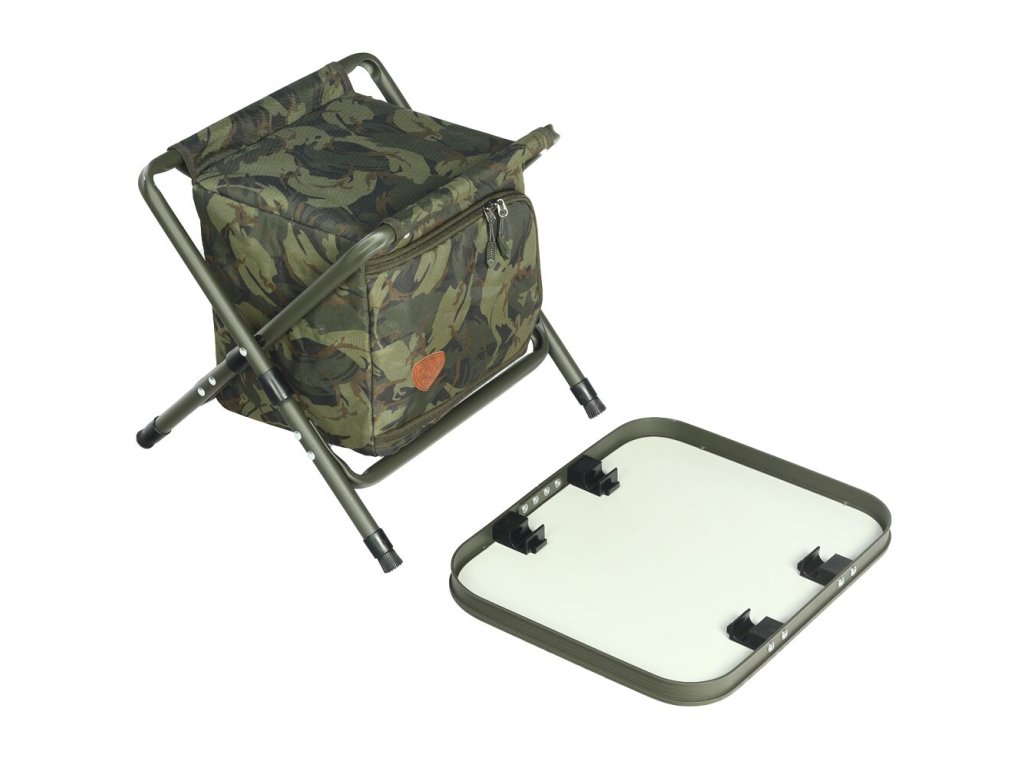 Vylepšená konštrukcia, ktorá zaručí jednoduchšie zostavenie a malé prepravné rozmery. Štyri výškovo nastaviteľné nohy, ktoré majú na svojich koncoch protišmykové packy. Transportný obal je všitý v spodnej časti tašky a vďaka tomu ho máte vždy pripravený na zabalenie. Konštrukcia je vyrobená z hliníkových rúrok s priemerom 19 a 20mm. Textilná časť je vyrobená z nepremokavej polyesterovej tkaniny, ktorá je v decentnom kamuflážovom vzore.