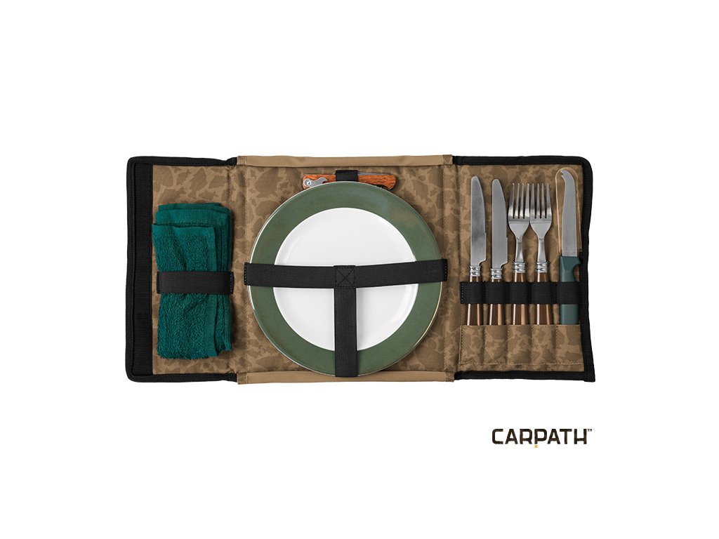 Jedálenská súprava, ktorá vám aj v odľahlých oblastiach kempovania dopraje komfort civilizácie :) V šikovne zloženom sete nájdete úhľadne uložené dva plastové taniere, multifunkčný nôž (otvárak na pivo, konzervy, vývrtku a nožík), dve vidličky dva príborové nože, jeden ostrý nôž. Príjemným detailom je aj priložený uteráčik.