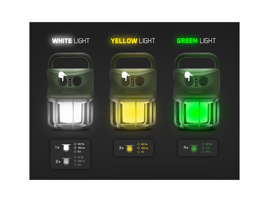 Jednotlivé režimy sa prepínajú jednoduchým stláčaním hlavného spínača. Prvým kliknutím sa aktivuje biele svetlo so 100 % intenzitou (450 lm), druhým sa intenzita bieleho svetla zníži na 50 % (280 lm). Tretím stlačením sa prepne na príjemné žlté svetlo s plným výkonom (450 lm), pri ktorom výdrž batérie dosahuje približne 11 hodín. Štvrté kliknutie aktivuje zelené svetlo, ktoré je ideálne ako pozičné osvetlenie a dokáže svietiť až 24 hodín. Piatym stlačením sa zapne bočná LED dióda so 100 % intenzitou (130 lm), pričom výdrž batérie v tomto režime je približne 21 hodín. Šieste kliknutie zníži intenzitu bočnej LED na 50 %, čím sa dosiahne maximálna výdrž svietenia až 24 hodín.