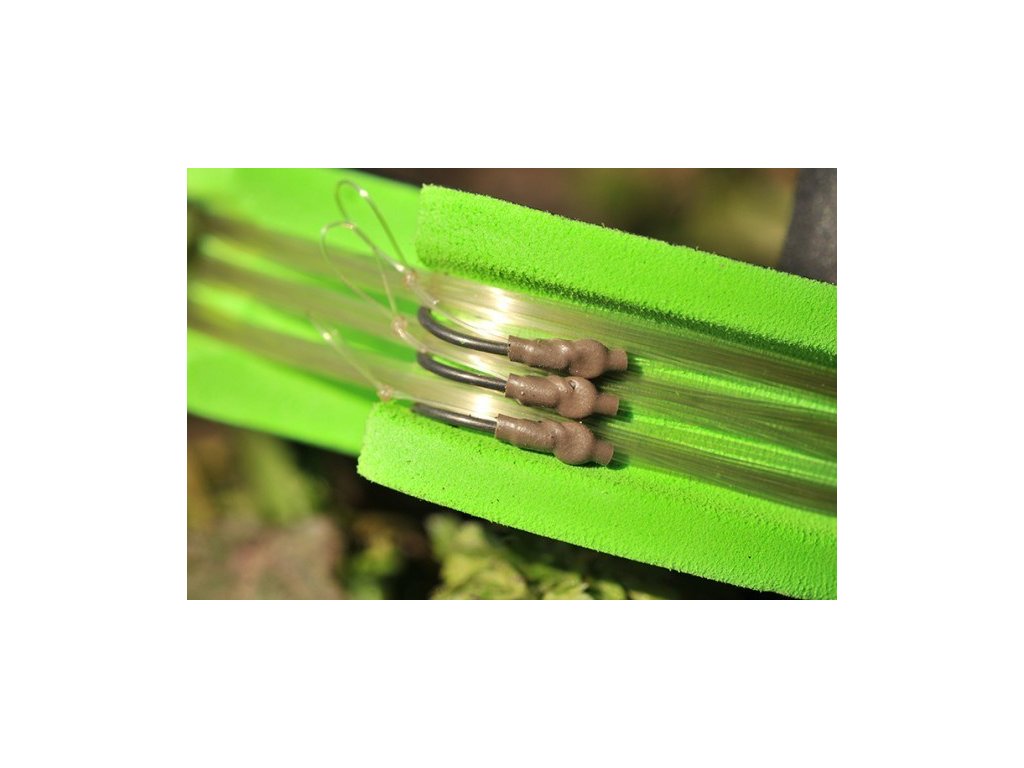 Háčik má ideálny tvar pre tento lov a hlavne neskutočnú ostrosť hrotu. Tie sú priviazané na 8lb špeciálny zig rig vlasec, ktorý nie je číry, ale je mierne zafarbený pre lepšiu kamufláž na väčšinu vôd. K dispozícii sú celkom 4 dĺžky náväzcov, ktoré sú balené vždy po 3ks na jednej EVA špulke. Vďaka tomuto praktickému baleniu sa nadväzce nemotajú a nevznikajú na nich ostré uhly, čo by zhoršovalo prezentáciu nástrahy. Po použití ich jednoducho namotáte späť na špulky a sú pripravené k ďalšiemu lovu.