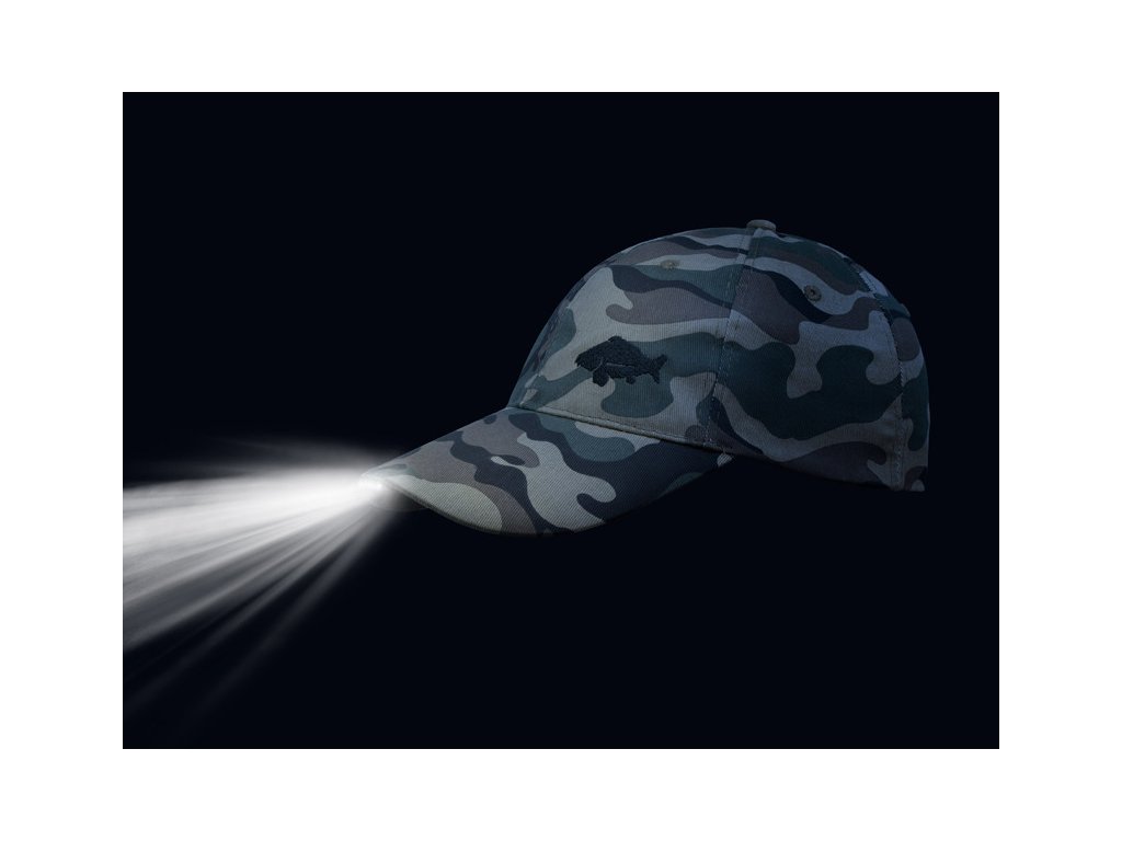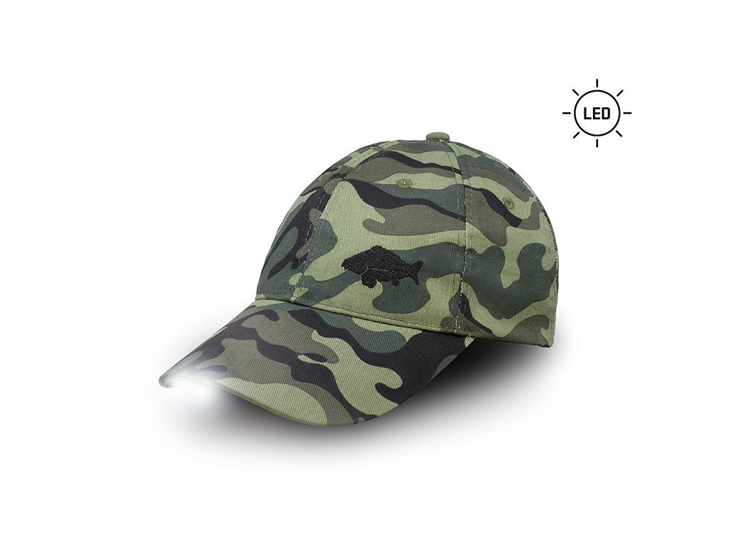 Praktická maskáčová šiltovka, vybavená LED svietením v šilte, určená pre všetkých zanietených rybárov.