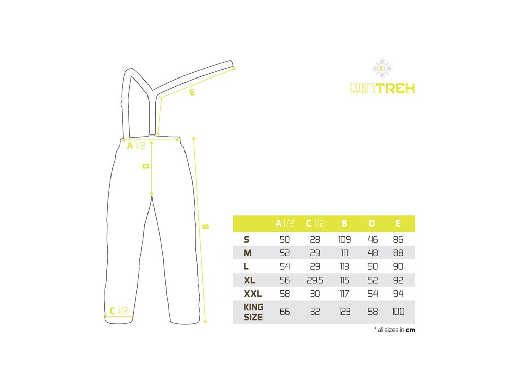 Nohavice WinTREK disponujú vreckami na zips po obidvoch bokoch, pričom zipsy sú prešité výraznou žltou textíliou a prekryté lemom z vodoodolnej tkaniny. Na páse sa nachádzajú gumené traky nastaviteľné podľa Vašej výšky a kompletne odopínateľné na suché zipsy. Samotný pás disponuje všitou gumičkou zvyšujúcou jeho flexibilitu a pružnosť. Vnútorná strana je tvorená hladkou prešívanou látkou, vďaka ktorej sa nohavice ľahko obliekajú a dobre nosia.