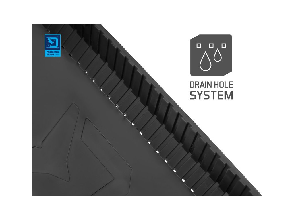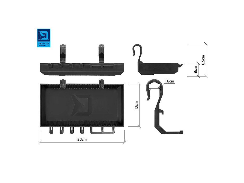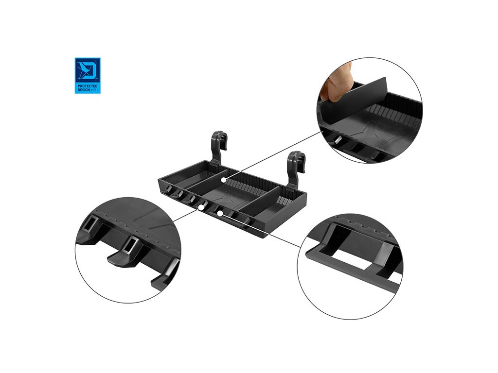 Ďalším doplnkom sú háčiky v prednej časti slúžiace pre zavesenie nadväzcov, prípadne zasunutie ihly, nožníc, alebo inej pomôcky potrebnej počas lovu. Vyberateľné prepážky umožňujú optimalizovať úložný priestor presne podľa vašich predstáv. Polica je navrhnutá v obľúbenom čiernom dizajne BlackWAY a teda skvele doplní stojany z našej produkcie.