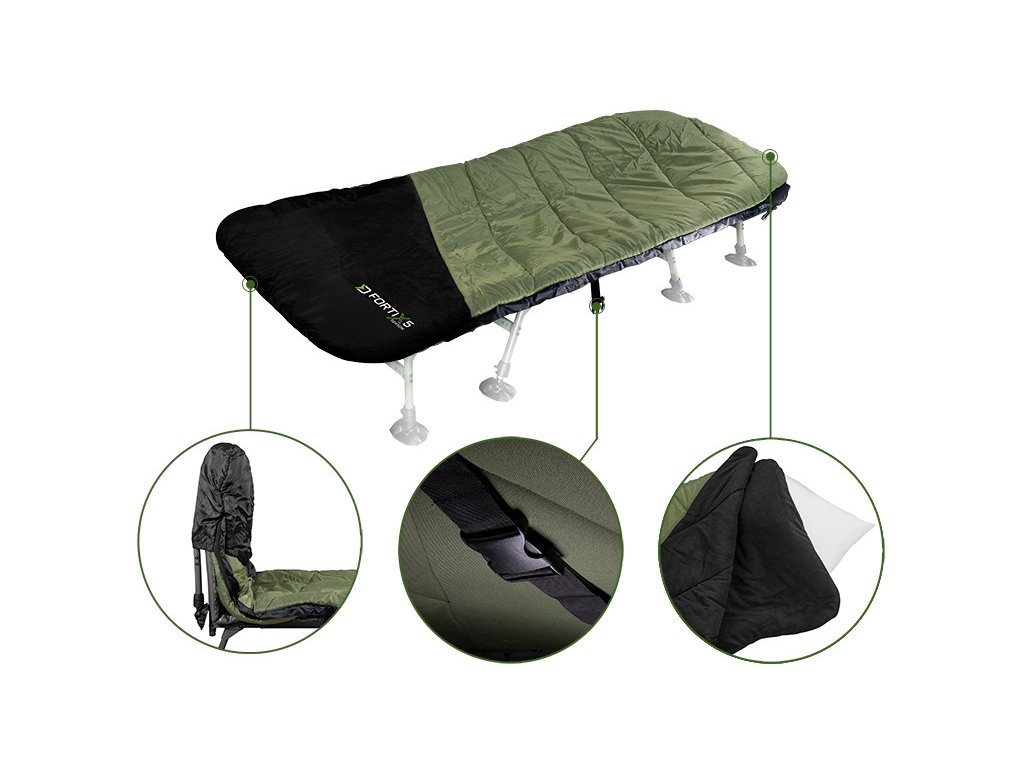 Na oboch koncoch spacieho vaku FORTIX sú zo spodnej strany našité prevleky, slúžiace k natiahnutiu na lehátko. Samozrejmosťou je fixačný popruh s masívnym klipom v strednej časti spacieho vaku. Vďaka prevlekom v kombinácií s popruhom nebude dochádzať k neželanému krúteniu na lehátku.