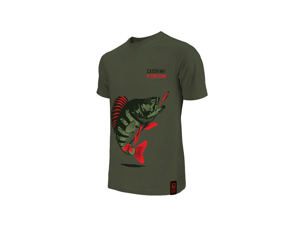 Tričko Catch me! OSTRIEŽ je dizajnované v tmavo zelenej farbe s vyobrazením ostrieža, ktorý sa práve blíži k nástrahe, čo je moment, na ktorý čakajú všetci priaznivci lovu týchto rýb.