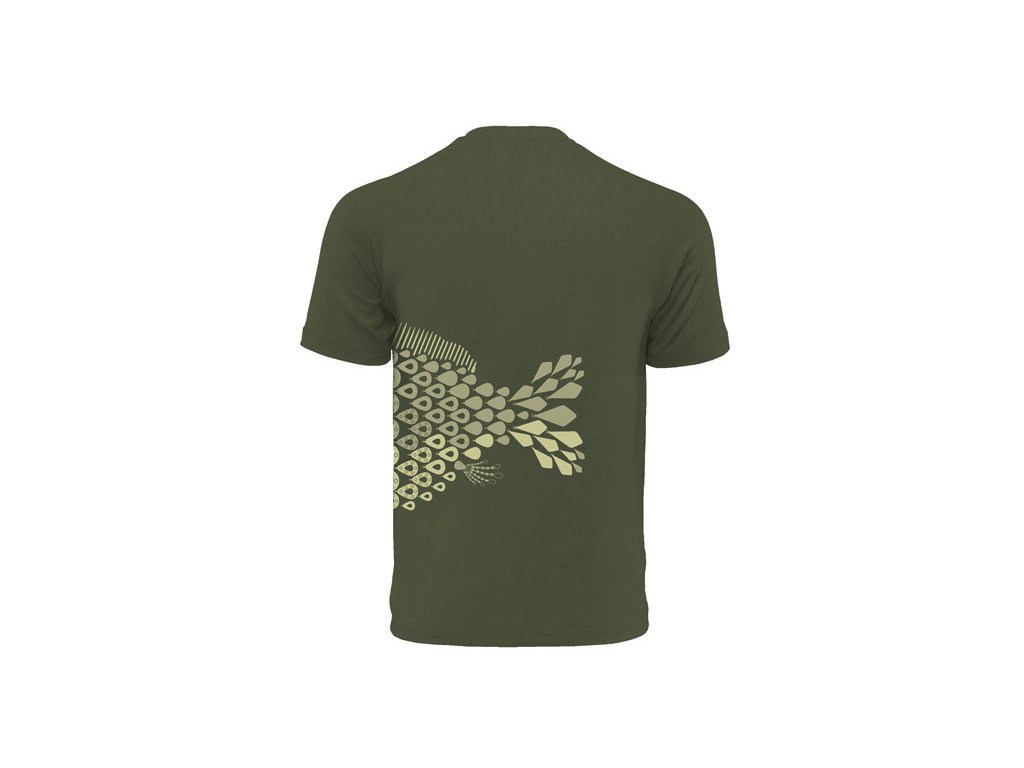 Je vyrobené z materiálu tmavo zelenej farby, čím dokonale zapadne do prírodného prostredia. Motív kapra vyobrazený na tričku je kompletne navrhnutý z jednotlivých prvkov kaprárskej montáže ako sú obratlíky, olovká, nadväzec a podobne. Tým sa stáva Delphin TACKLE rozpoznateľným a naozaj jedinečným kúskom medzi kaprárskym oblečením.