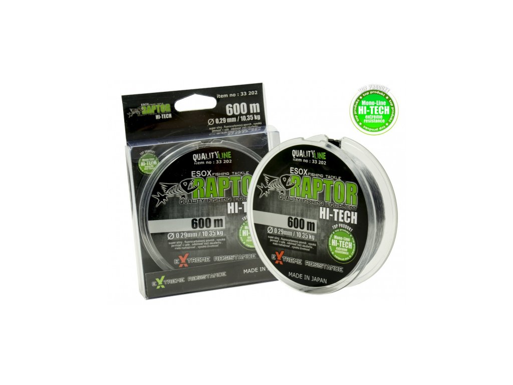 Raptor Hi-Tech je vlasec uznávaný aj medzi odborníkmi ako jeden z najlepších produktov na trhu. Pri jeho výrobe bol použitý úplne nový proces spracovania špeciálnej suroviny, kontrolovaný do najmenších detailov. Vlasec má fluorocarbónovú povrchovú úpravu, vďaka čomu je výnimočne hladký a takmer vodeodolný. Aj po namočení si teda drží takmer celú svoju silu, ktorá u mnohých bežných vlascov klesá aj o 15%. Vďaka novému materiálu a technológii má Raptor Hi-Tech výnimočnú mäkkosť a nízku pružnosť, pri zachovaní veľmi vysokej pevnosti. Pod vodnou hladinou je takmer neviditeľný.