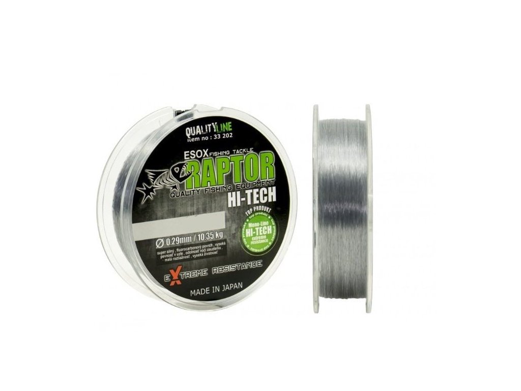 Raptor Hi-Tech je vlasec uznávaný aj medzi odborníkmi ako jeden z najlepších produktov na trhu. Pri jeho výrobe bol použitý úplne nový proces spracovania špeciálnej suroviny, kontrolovaný do najmenších detailov. Vlasec má fluorocarbónovú povrchovú úpravu, vďaka čomu je výnimočne hladký a takmer vodeodolný. Aj po namočení si teda drží takmer celú svoju silu, ktorá u mnohých bežných vlascov klesá aj o 15%. Vďaka novému materiálu a technológii má Raptor Hi-Tech výnimočnú mäkkosť a nízku pružnosť, pri zachovaní veľmi vysokej pevnosti. Pod vodnou hladinou je takmer neviditeľný.
